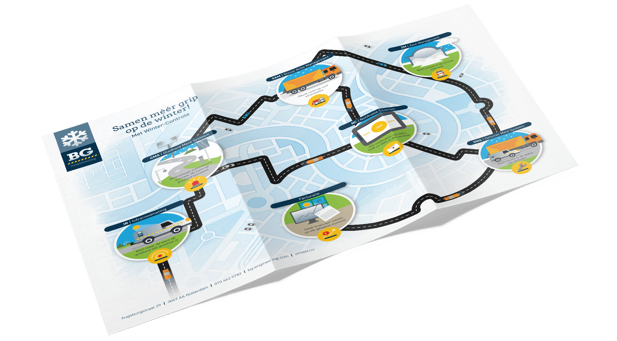 BG-Engineering helpt overheidsinstanties en bedrijven de wegen begaanbaar en veilig te houden. En wij helpen dit jonge, dynamische team met hun communicatie. De website vormde de basis voor de nieuw huisstijl. Met brochures en promotiemateriaal zorgen wij dat BG-Engineering zichtbaar is op beurzen. Met digitale magazines, gevuld met mooie klant verhalen, houden zij de contacten warm met hun relaties. Dit zijn de communicatie middelen die wij inzetten om BG-Engineering op de kaart te zetten.