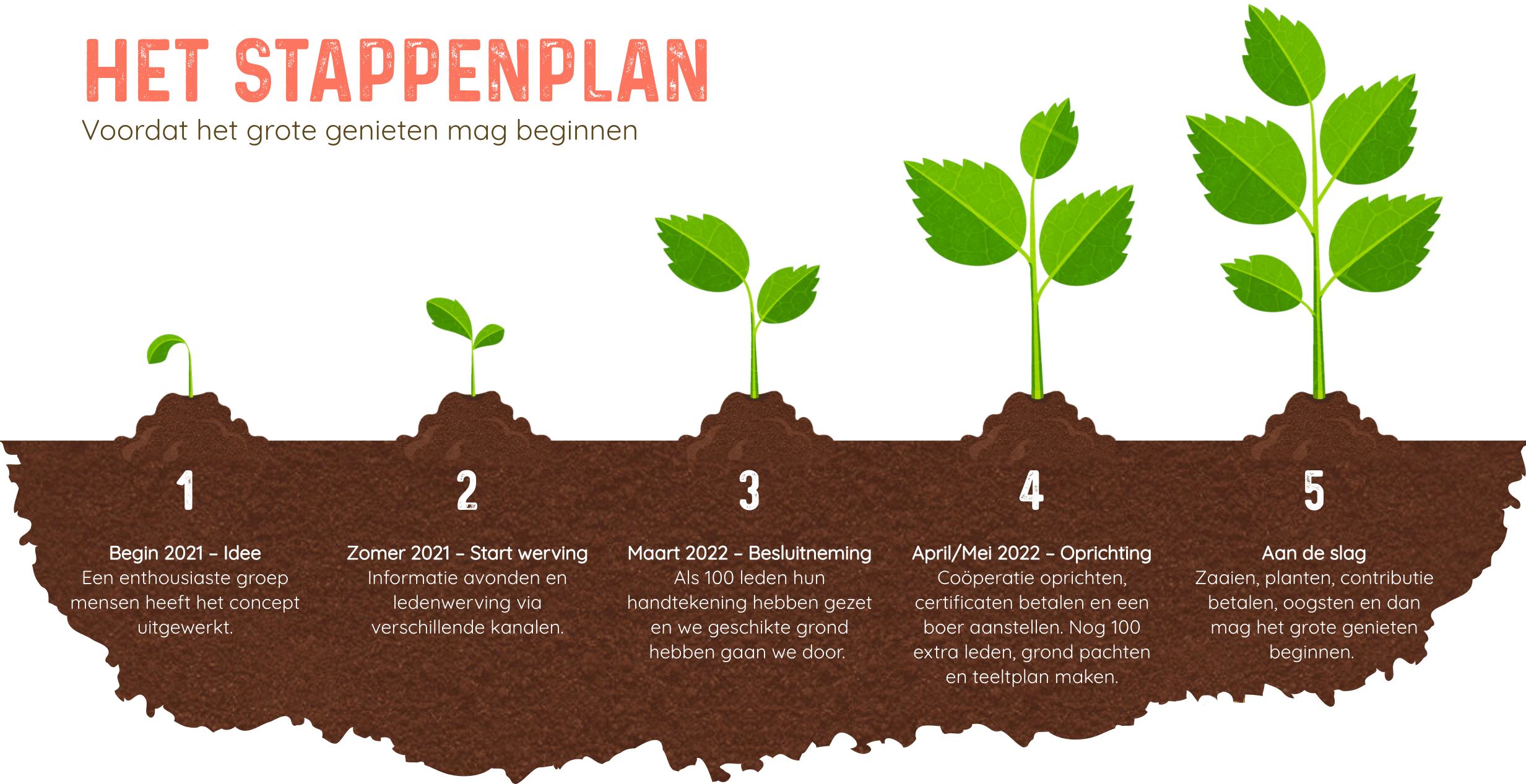 We zitten nu in de tweede fase van het stappenplan, achter de schermen wordt hard gewerkt om 100 leden te werven en geschikte grond te zoeken.